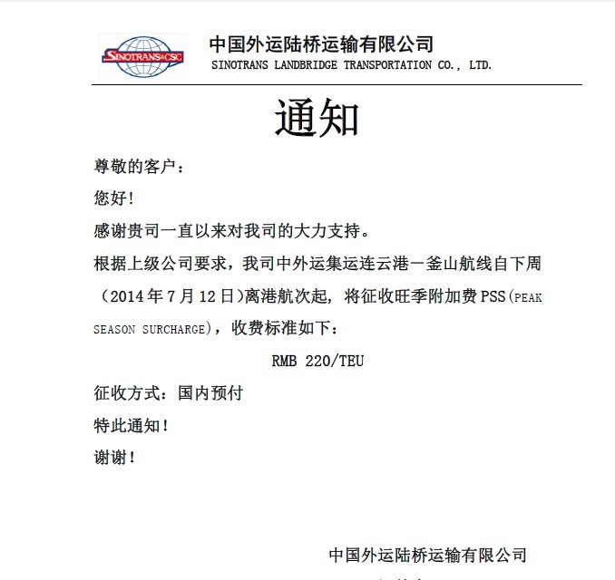 外运2014.7月份征收PSS通知