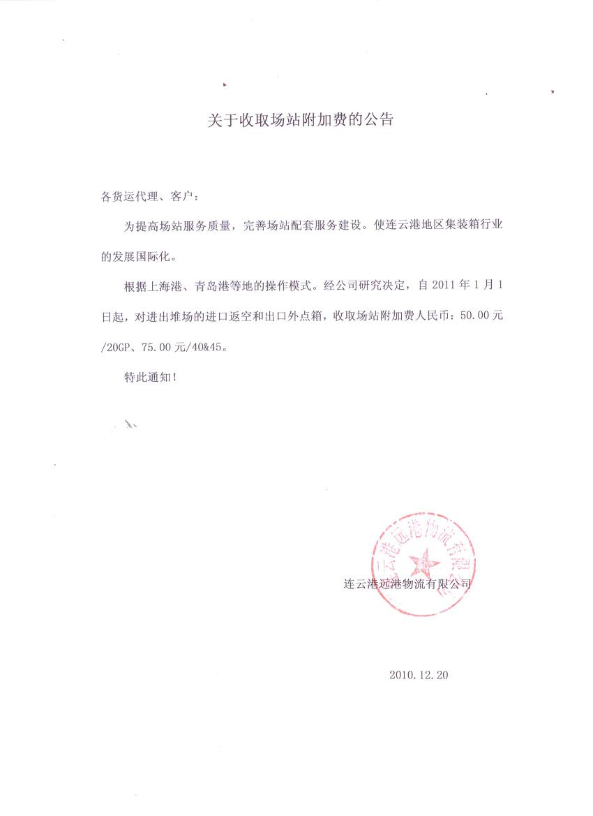 连云港2011年关于收取场站附加费公告