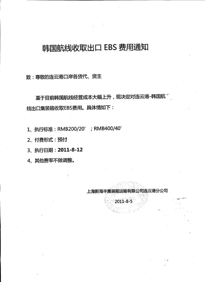 连云港韩国线8月12日起增收EBS